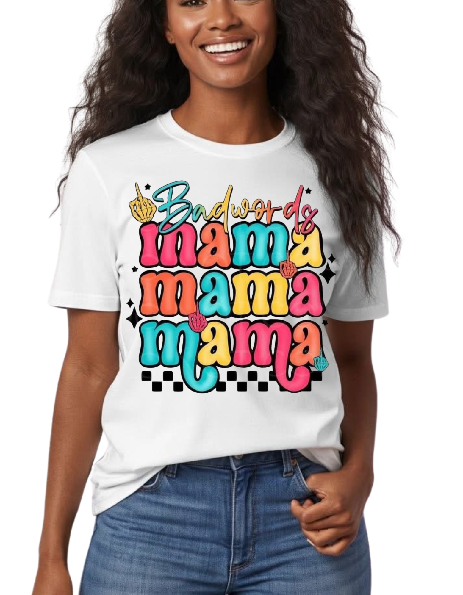 This 100% cotton crew neck shirt features vibrant colors and a playful "badword mama" design, perfect for weekend outings with your kids. Crafted from soft, breathable fabric, it ensures comfort and durability for active family time. Its bold style adds a fun, confident touch to casual wear.
